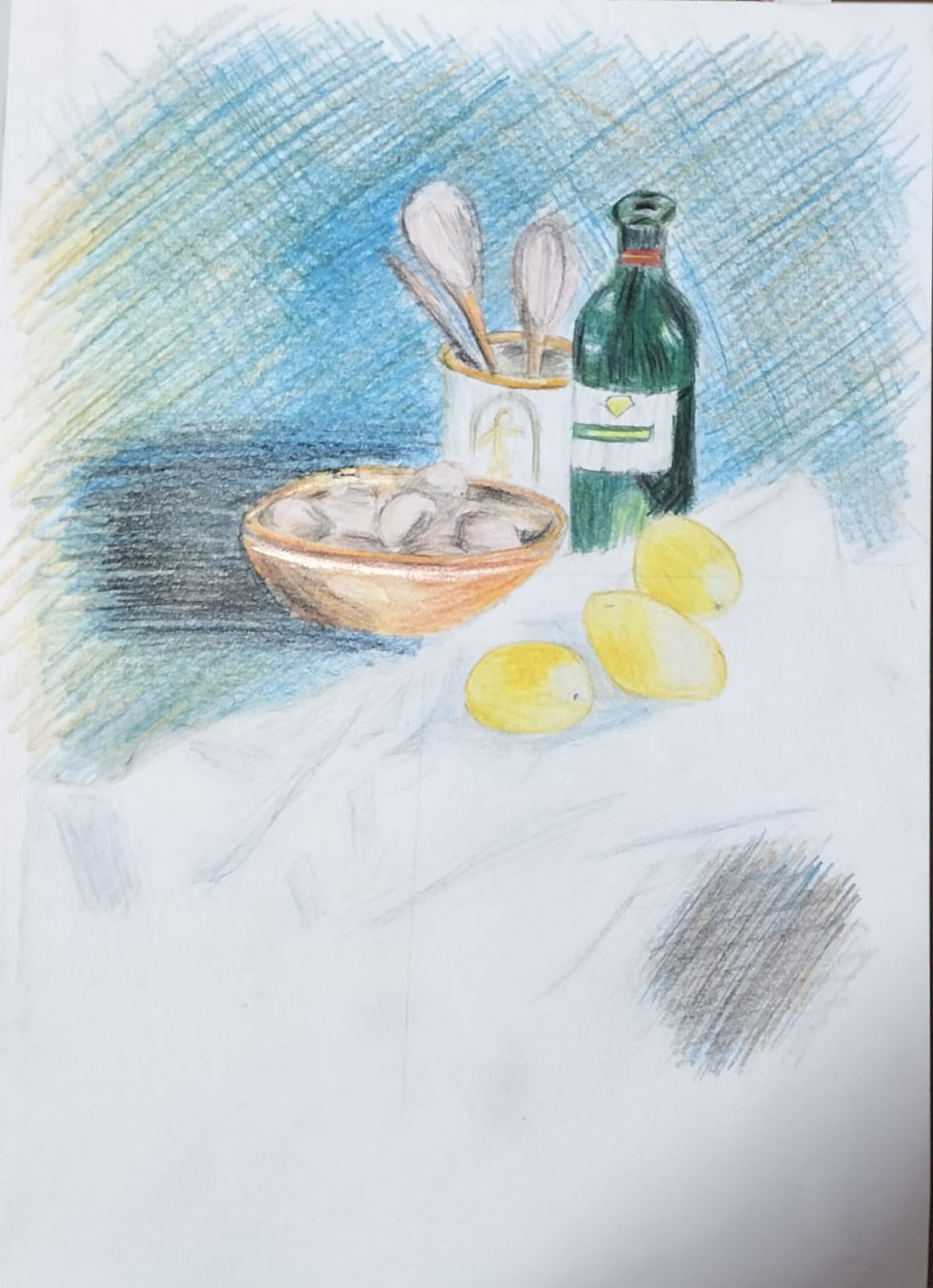 I think one of the many reasons I never enjoyed doing still life was due to how much organic material I had to draw. Items such as cloth, glass bottles(not organic), but in essence, items which involved shadows and realism were always drawings I struggled with. This was certainly no different; I grappled with highlights on wine bottles and the folds in table cloth. I was able to eventually get it to a passable level of realism, which ended up looking like this: